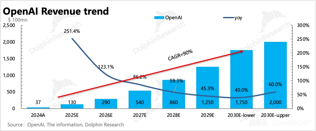 至少在我们的模型中,2030 年的 Meta 数据中心的新增算力只有 1GW,但折旧成本还有 17% 的增速。若要在此之前将 OPM 从 27 年的 36% 拉回到 25 年的 40% ,那么 2030 年收入要达到 4360 亿,相比 2025 年不到 2000 亿的收入水平直接要求翻倍还要多!有意思的巧合,这多出来的 2000 多亿,刚好也是 OpenAI 对自己 2030 年的收入增长目标。