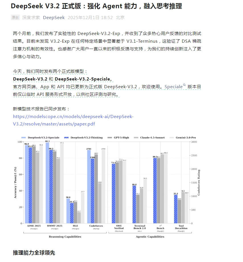 12月1日晚间,DeepSeek正式发布新一代开源大模型DeepSeek-V3.2及其长思考增强版DeepSeek-V3.2-Speciale。官方网页端、App及API已同步更新至V3.2版本。DeepSeek-V3.2的目标是平衡推理能力与输出长度,适合日常使用,例如问答场景和通用 Agent 任务场景。DeepSeek-V3.2-Speciale的目标是将开源模型的推理能力推向极致,探索模型能力的边界。
