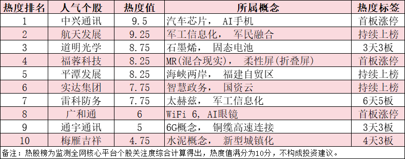 今日,A股十大人气热股如下:中兴通讯、航天发展、道明光学、福蓉科技、平潭发展、实达集团、雷科防务、广和通、通宇通讯、梅雁吉祥。