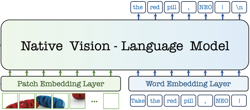 原生图块嵌入 (Native Patch Embedding): 摒弃了离散的图像 tokenizer,通过独创的 Patch Embedding Layer (PEL) 自底向上构建从像素到词元的连续映射。这种设计能更精细地捕捉图像细节,从根本上突破了主流模型的图像建模瓶颈。