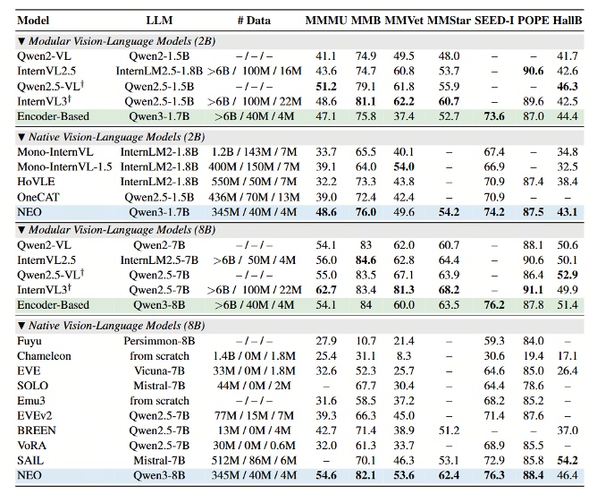 作为行业首个可用的、实现深层次融合的原生多模态架构(Native VLM),NEO 从底层原理出发,打破了传统“模块化”范式的桎梏,以“专为多模态而生”的创新设计,通过核心架构层面的多模态深层融合,实现了性能、效率和通用性的整体突破,重新定义了多模态模型的效能边界,标志着人工智能多模态技术正式迈入“原生架构”的新时代。