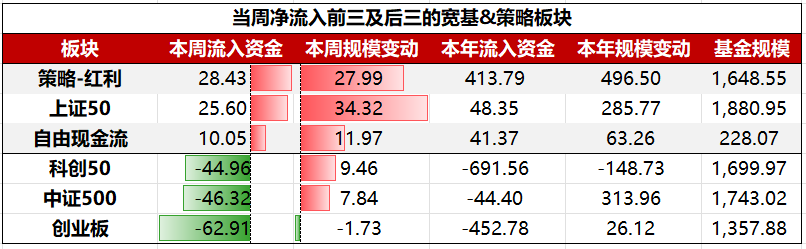 具体到细分板块,宽基&策略板块ETF中,净流入前三大板块依次为:策略-红利、上证50、自由现金流;净流出前三大板块依次为:创业板、中证500、科创50。