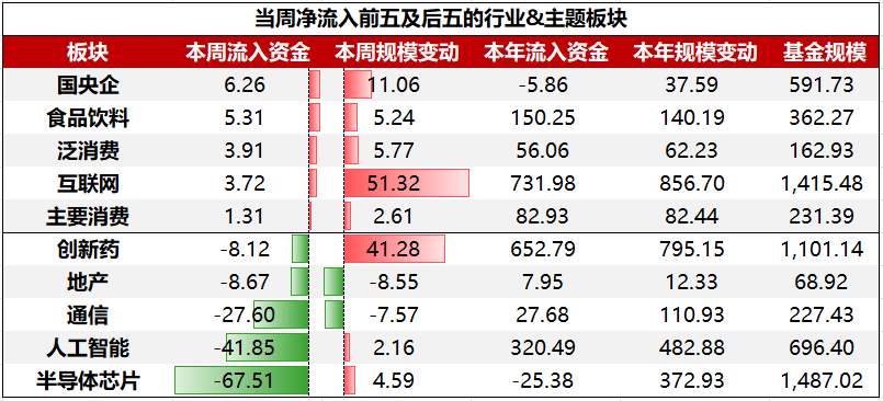 行业&主题板块ETF中,净流入前五大板块依次为:国央企、食品饮料、泛消费、互联网、主要消费;净流出前五大板块依次为:半导体芯片、人工智能、通信、地产、创新药。