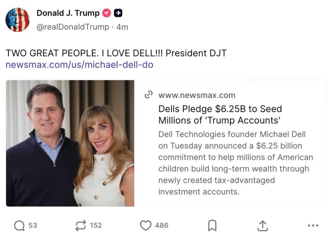 美国总统特朗普在社交媒体上迅速回应,发文盛赞戴尔夫妇的贡献。他写道:“两位伟大的人,我爱戴尔!”这一表态进一步提振市场信心,戴尔科技股价当日上涨近3%,盘中涨幅一度突破4.5%。