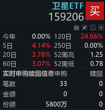 12月3日,卫星ETF(159206)盘中净申购超5800万份。成分股方面涨跌互现,睿创微纳(688002)领涨1.82%,唯捷创芯(688153)上涨0.88%,光迅科技(002281)上涨0.80%。