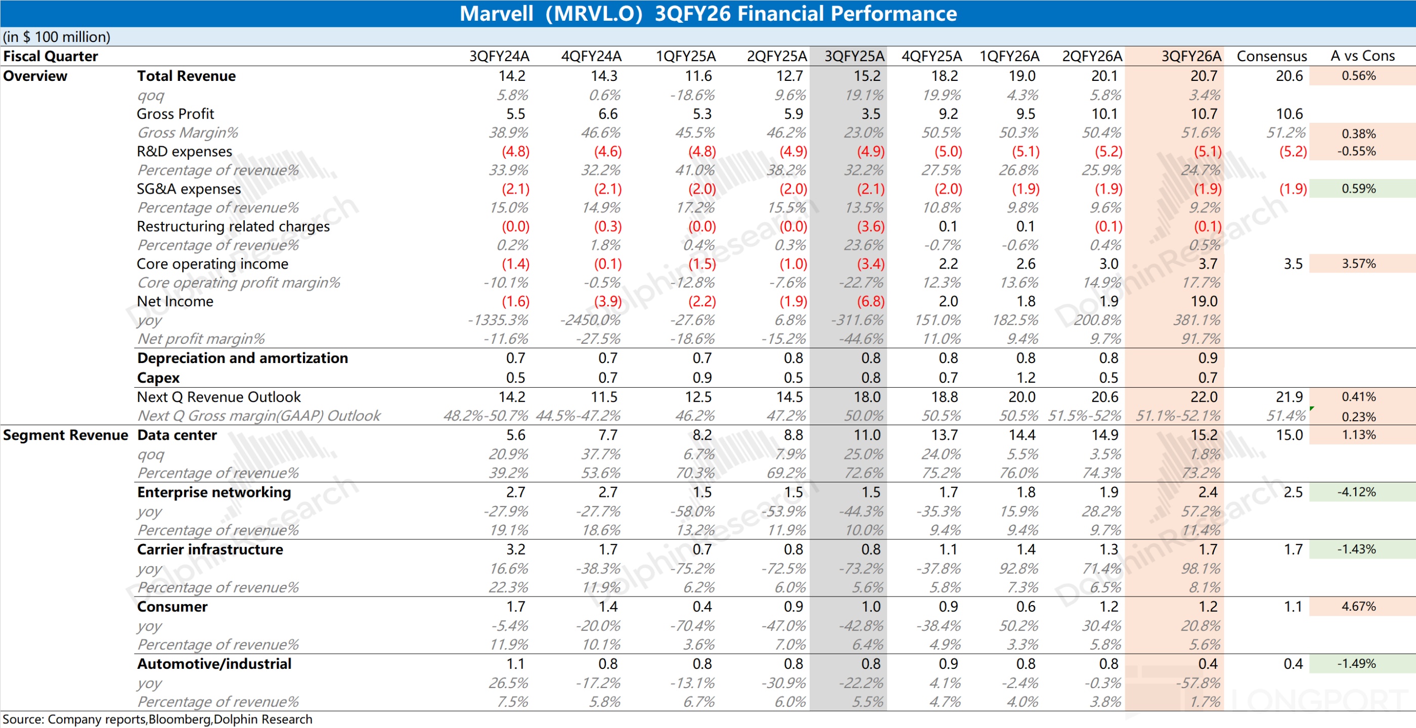 迈威尔科技 Marvell 在 2026 财年第三季度实现营收 20.7 亿美元,环比增长 3.4%,符合市场预期(20.6 亿美元)。公司本季度营收端的增长,主要来自于企业网络及运营商业务的带动。受定制 ASIC 业务环比下滑的影响,数据中心业务环比微增。