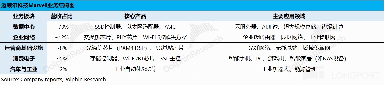 1)数据中心业务(75% 左右):高成长业务,受益于数据中心及 ASIC 需求的推动,是当前市场最主要的关注点。业务中包括光电互联产品、SSD 控制器、定制 ASIC 业务(亚马逊 AWS、谷歌 Axion CPU 等定制化芯片)等,主要应用于云服务器、边缘计算等场景;