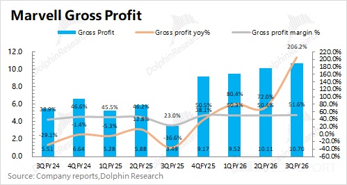 迈威尔科技 Marvell 在 2026 财年第三季度实现毛利 10.7 亿美元,环比增加 0.6 亿美元。其中 Marvell 在本季度的毛利率为 51.6%。