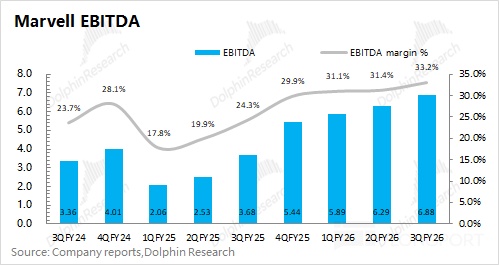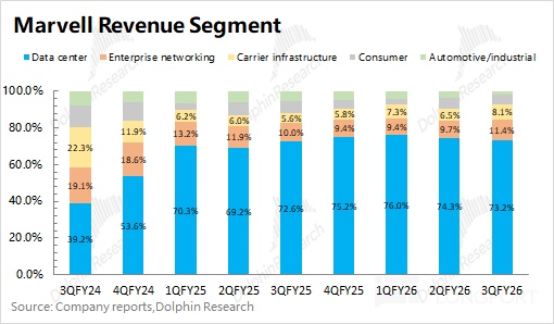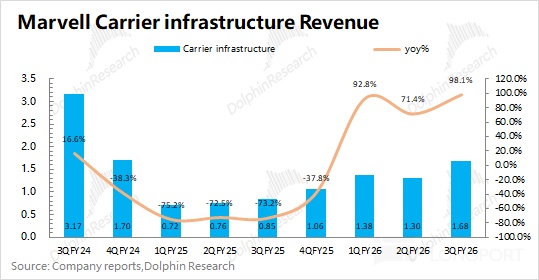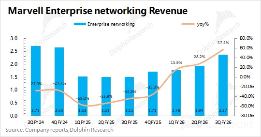 1)迈威尔科技 Marvell 在 2026 财年第三季度的企业网络业务和运营商基建业务分别实现营收 2.37 亿美元和 1.68 亿美元。两项业务本季度环比继续增长,反映出公司及园区的网络产品需求、运营商的光通信芯片和 5G 基站芯片等相关需求有所回升。