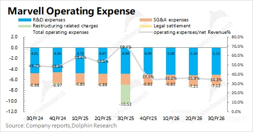 由于公司毛利率受收购资产摊销等方面的影响,因而财报中的毛利率并不能直接体现出经营情况。在剔除该影响后,海豚君参考调整后的毛利率,公司本季度调整后的毛利率为 59%。本季度毛利率环比略有回升,主要是由于毛利率较低的定制 ASIC 业务环比下滑,对整体毛利率产生结构性影响。