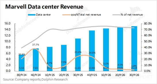 迈威尔科技 Marvell 在 2026 财年第三季度的数据中心业务实现营收 15.2 亿美元,环比增长 1.8%,符合市场预期(15 亿美元)。公司数据中心业务本季度的增长主要来自于光电互联产品的增长。