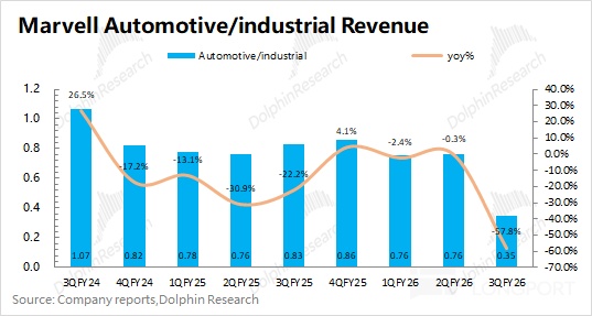 3)迈威尔科技 Marvell 在 2026 财年第三季度的汽车/工业业务实现营收 0.35 亿美元。公司已经对汽车以太网业务进行剥离,当前业务主要以工业市场为主,预计后续将保持相对平稳,长期年化营收预期为 1 亿美元左右,占比相对较小
