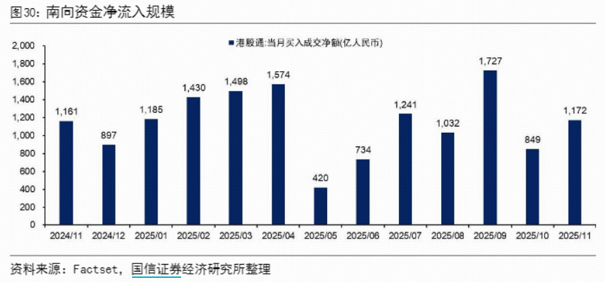 从南向资金来看,11月南向资金流入1172亿元。今年南向资金与往年有明显的不同,在港股下跌时依然逆向加仓,这体现了中资流动性的宽裕和加仓港股的意愿很强。