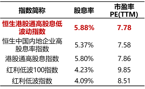 具体来看,截至12月2日,恒生港股通⾼股息低波动指数股息率(近12月发布方股息率,下同)为5.88%,在同类红利类指数中相对更高;市盈率7.78倍PE(TTM),估值相对较低。