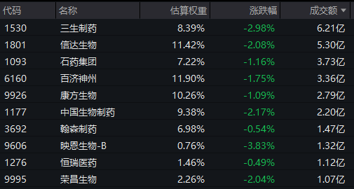 港股通创新药ETF(159570)标的指数权重股多数飘绿:三生制药、信达生物、中国生物制药跌超2%,石药集团、百济神州、康方生物跌超1%。