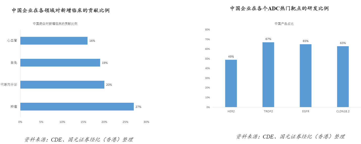 中国医药企业开展创新药临床试验数量大幅增长,在各个重点领域及热门靶点的研发在全球的地位也大幅上升,在肿瘤领域的贡献比例为27%,自免领域为19%。