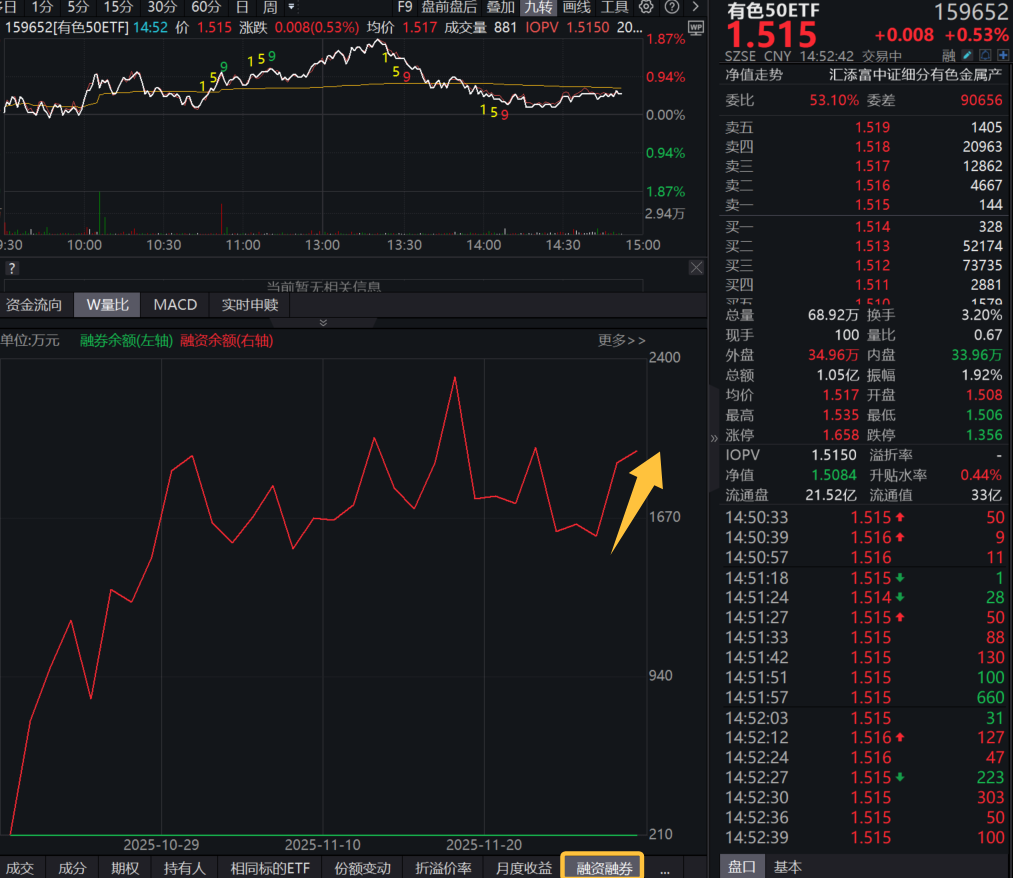 两融资金方面,有色50ETF(159652)融资余额连续冲高,最新融资余额近2000万元。