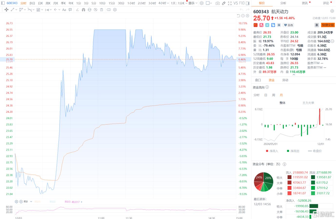 截至收盘,该股收涨6.46%报25.7元,成交额51.3亿元,振幅达19.97%,换手率32.78%。