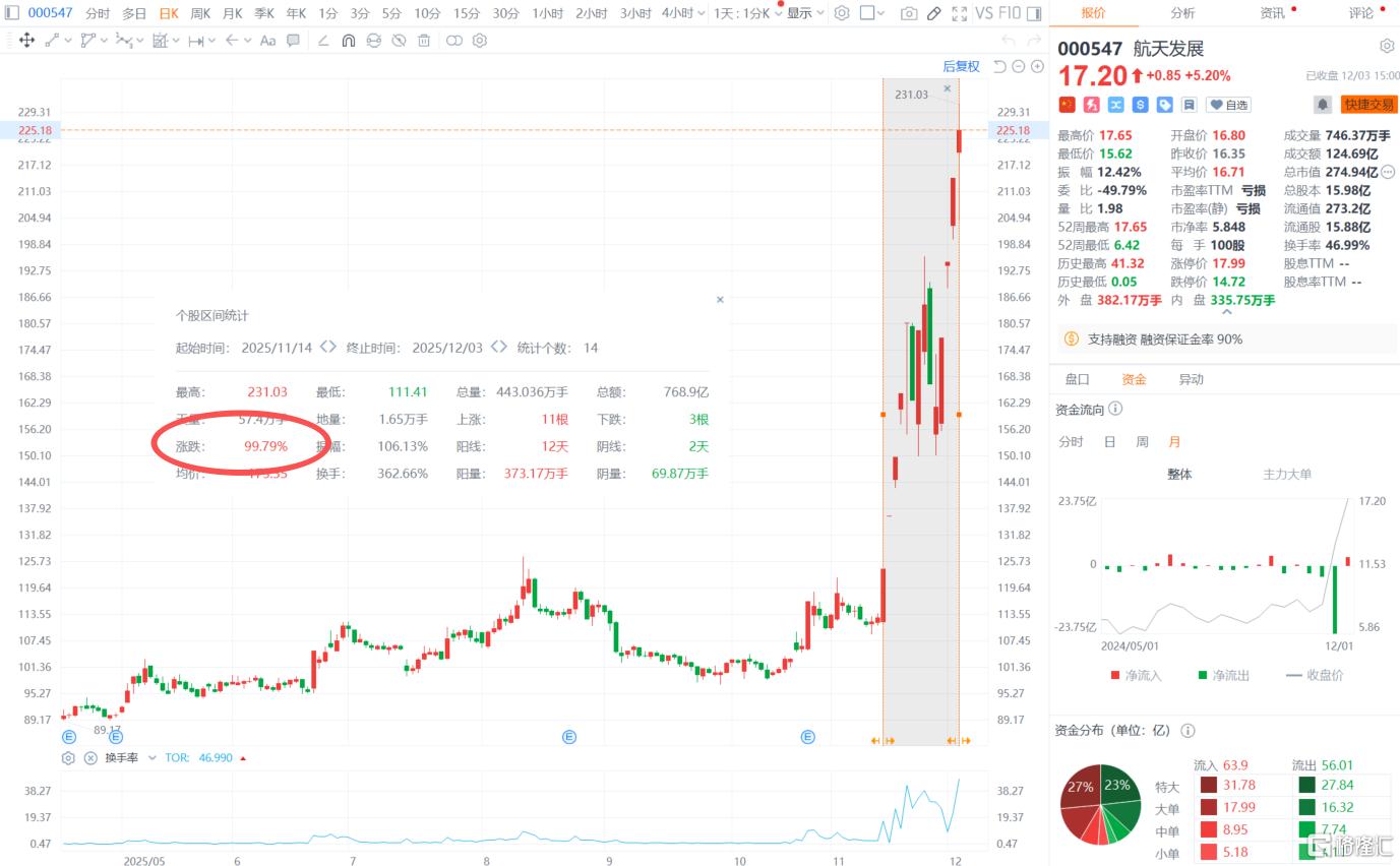 自11月中旬以来,航天发展涨势迅猛,近14个交易日累计涨幅超99%。