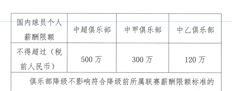 球员薪酬方面,国内球员(含港澳台)个人年薪税前上限为:中超500万元、中甲300万元、中乙120万元。国内球员平均年薪亦设限:中超不超过300万元、中甲150万元、中乙50万元。