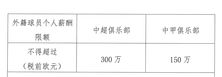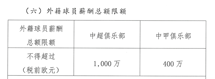 外籍球员个人年薪上限为中超300万欧元、中甲150万欧元;俱乐部外援薪酬总额上限为中超1000万欧元、中甲400万欧元。