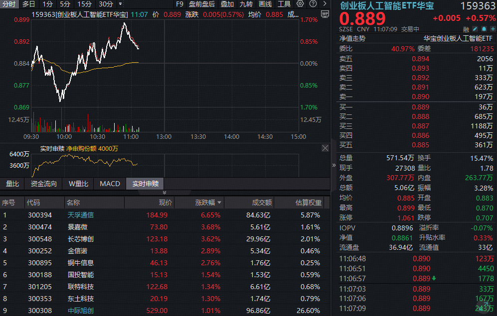 4日早盘,光模块CPO等算力硬件继续活跃,易中天接力连涨,今日天孚通信涨超8%冲击五连涨,新易盛冲击八连阳,中际旭创涨超1%,长芯博创、铜牛信息、金信诺、联特科技等多股涨超2%。热门ETF方面,光模块CPO含量超56%创业板人工智能ETF159363)场内下探回升,盘中翻红拉升逾1%,放量成交5亿元领跑同类。