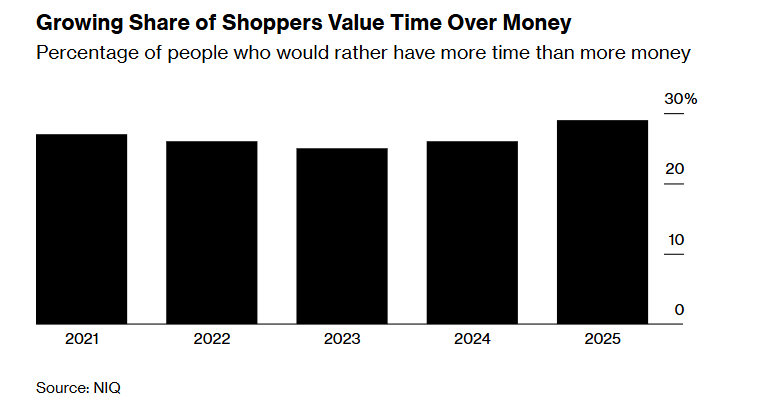 市场研究机构NIQ的一项调查显示,表示“宁愿拥有更多时间而非更多金钱”的美国人比例,自2023年以来上升了4个百分点。摩根士丹利2024年的调查发现,消费者平均愿意为便利性多支付5%的溢价,尤其是年轻人以及年收入超过10万美元的群体,更倾向于为节省时间的商品或服务买单。