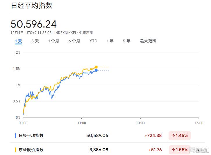 截至早盘收盘,日经225指数涨1.5%,东证指数涨1.6%。