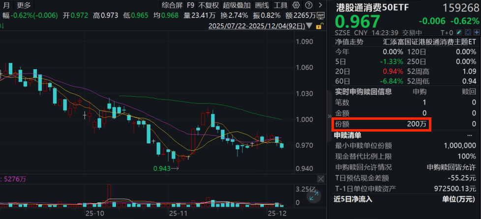 港股方面,新消费“纯”度更高的港股通消费50ETF(159268)跌近1%,成交额超2400万元!资金面上,盘中再获200万份净申购,近20日累计“吸金”超6700万元,规模同类持续领先!热门成分股多数飘绿:巨子生物跌超2%,泡泡玛特跌超1%,李宁、安踏体育、美的集团微跌;上涨方面,老铺黄金、海尔智家微涨。