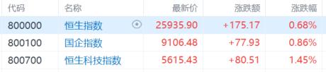 午后市场情绪回升,港股三大指数再度冲高,恒生科技指数一度涨至2%,最终收涨1.45%重回5600点上方,恒生指数涨0.68%报25935点,国企指数涨0.86%报9106点。