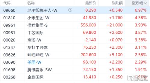 大型科技股普涨,地平线机器人涨超6%,小米集团涨超4%,携程集团、中芯国际涨超3%,美团等跟涨。
