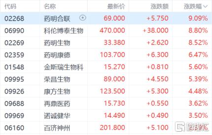 生物医药股大涨,药明合联涨超9%,科伦博泰生物、药明生物涨超8%,药明康德涨超6%,荣昌生物、康方生物等跟涨。