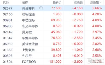 半导体股涨幅居前,英诺赛科涨超5%,芯智控股、中芯国际、宏光半导体涨超4%,贝克微、华虹半导体等跟涨。