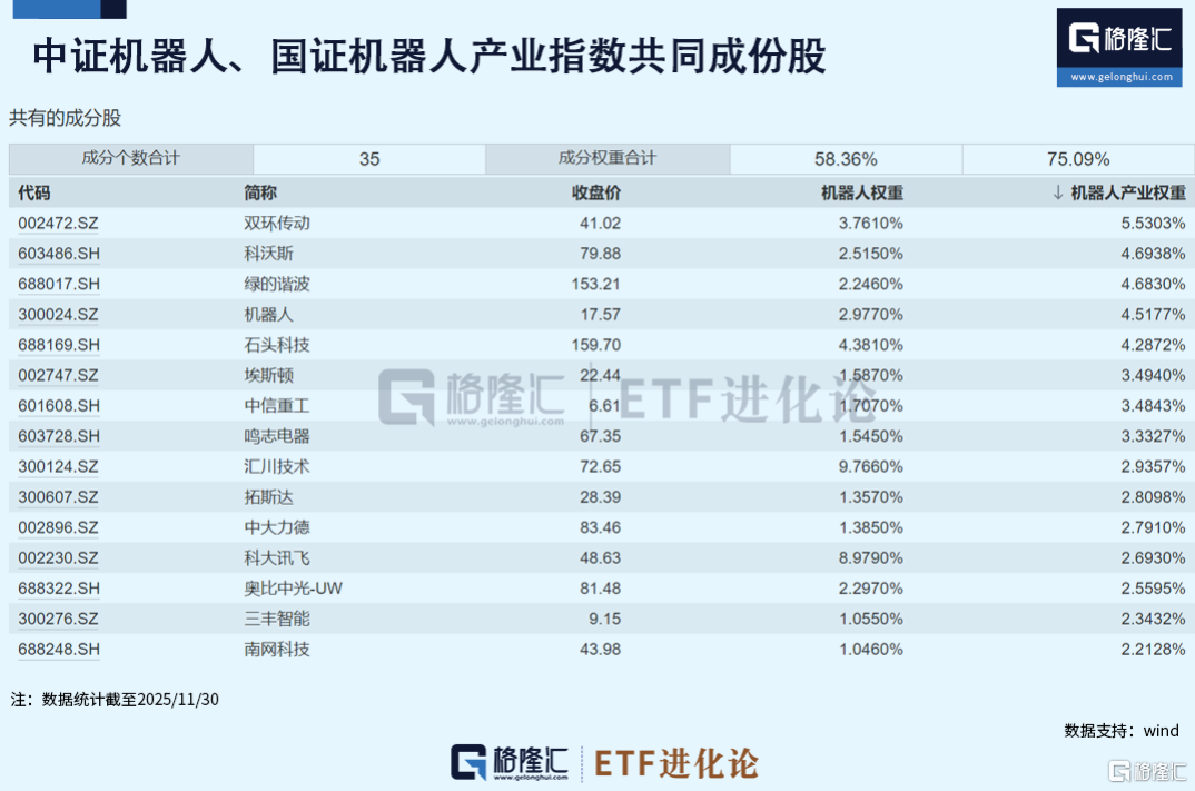 两者的共同成份股有35只,如双环传动、科沃斯、绿地谐波等,权重分别是58.36%和75.09%。