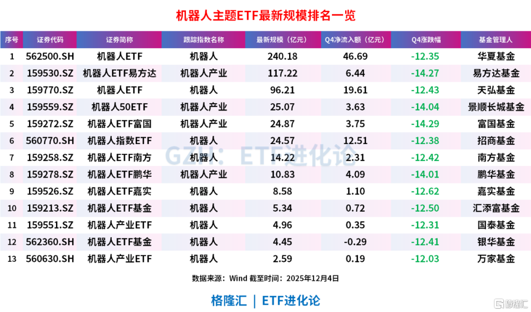 目前A股共有13只机器人主题ETF,其中规模百亿的有华夏机器人ETF和机器人ETF易方达,天弘机器人ETF最新规模逼近百亿。