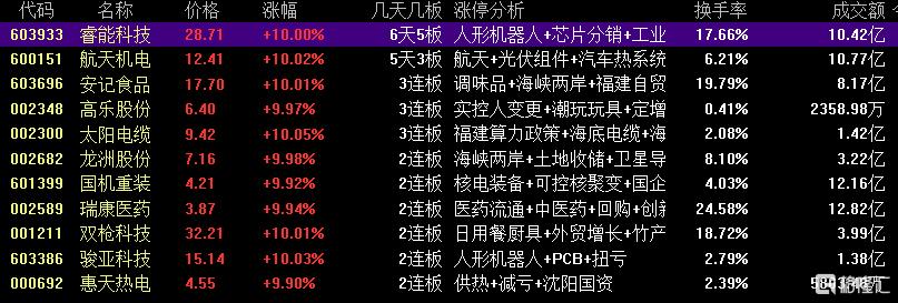 焦点股方面,市场连板高度降至4连板的高乐股份,福建本地股仍受追捧,福建 机器人的睿能科技6天5板,福建 电力设备的太阳电缆3连板,福建 消费的安记食品3连板。