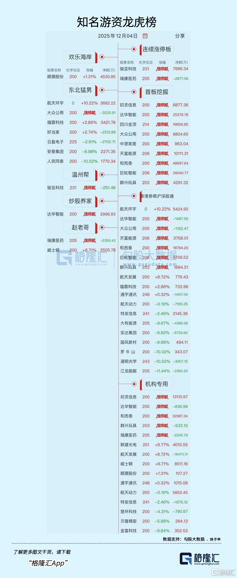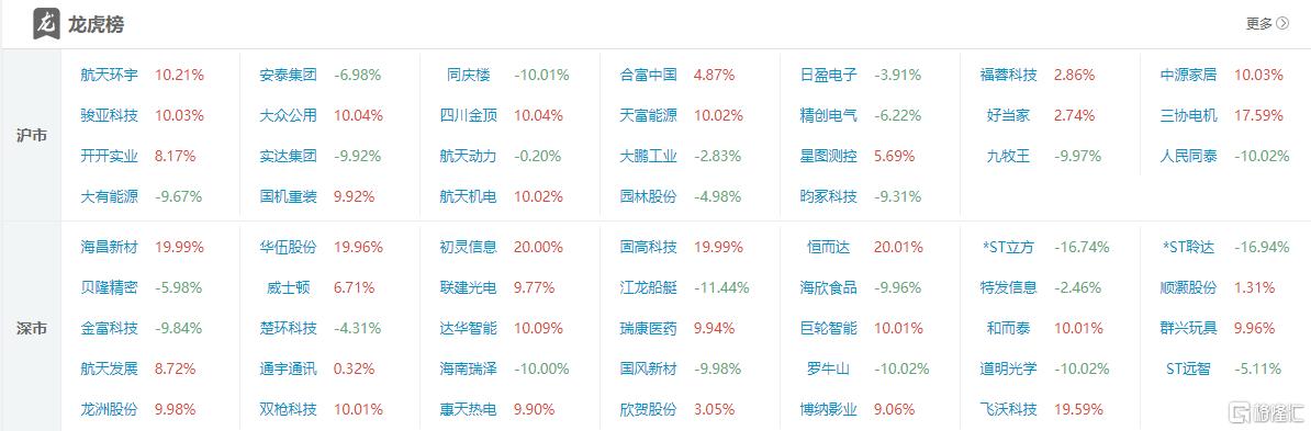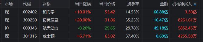 龙虎榜中涉及机构专用席位的个股中,当日净买入额前三为和而泰、初灵信息、航天动力,分别为3.30亿元、8261.61万元、5852.45万元。