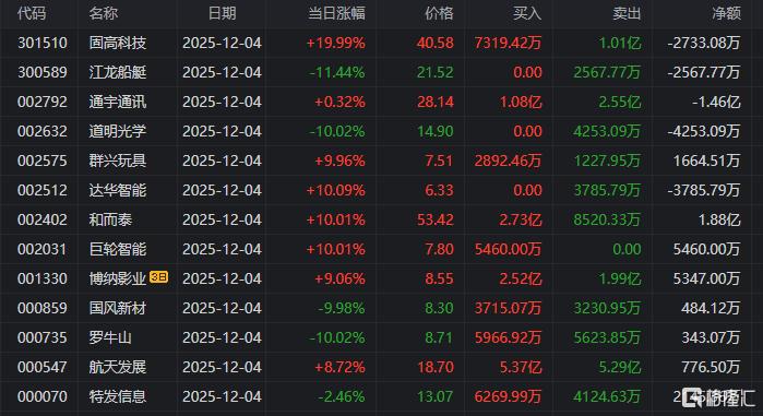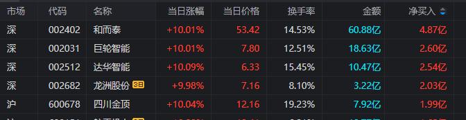 龙虎榜单日净买入额前三为和而泰、巨轮智能、达华智能,分别为4.87亿元、2.60亿元、2.54亿元。
