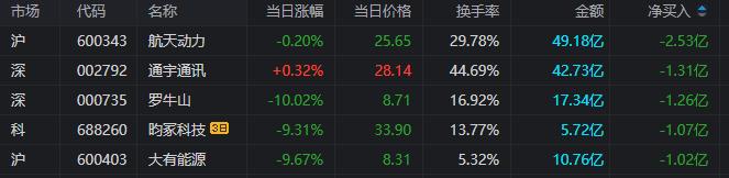 龙虎榜单日净卖出额前三为航天动力、通宇通讯、罗牛山,分别为2.53亿元、1.31亿元、1.26亿元。