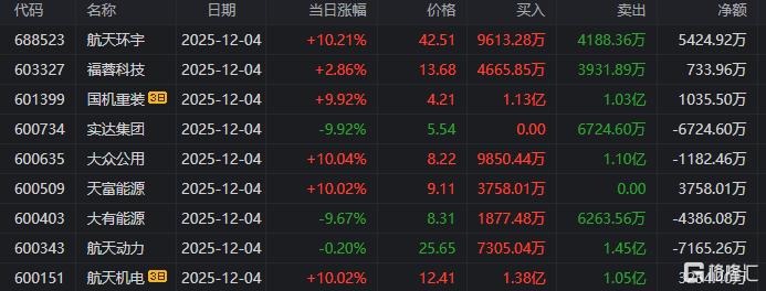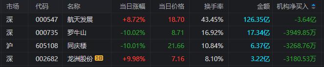 航天发展:上涨8.72%,换手率43.45%,成交量690.13万手,成交额126.35亿元。龙虎榜数据显示,机构合计净卖出3.64亿元,北向资金合计净买入776.43万元。上海超短帮、陈小群等知名游资榜上有名。
