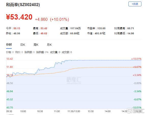 和而泰:今日涨停,换手率14.52%,成交量117.04万手,成交额60.88亿元。龙虎榜数据显示,机构合计净买入3.3亿元,北向资金合计净买入1.88亿元。