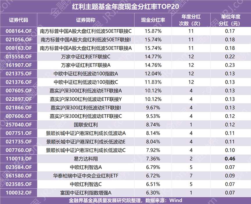 根据Wind数据统计(截至12月3日),全市场有9只红利主题基金(不同份额分开计算)的现金分红率超过10%。排在前三的均是南方标普中国A股红利低波50ETF的联接基金,现金分红率均超过15%。紧随其后的是万家中证红利ETF两只联接基金,分红率约14%;中欧中证红利低波100指数基金的A/C份额也分别达到12%和11%。