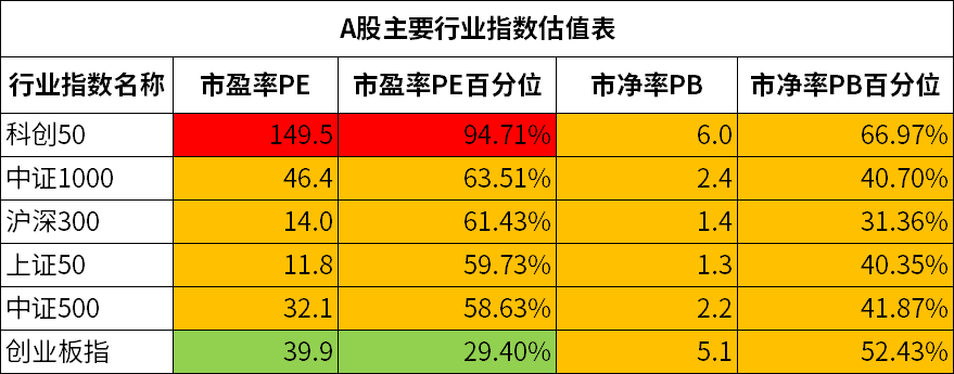 宽基指数:科创 50 估值极高(PE 149.5/94.71% 分位),创业板指PE较低(39.9/29.40% 分位),沪深300等主流宽基估值中性偏上。