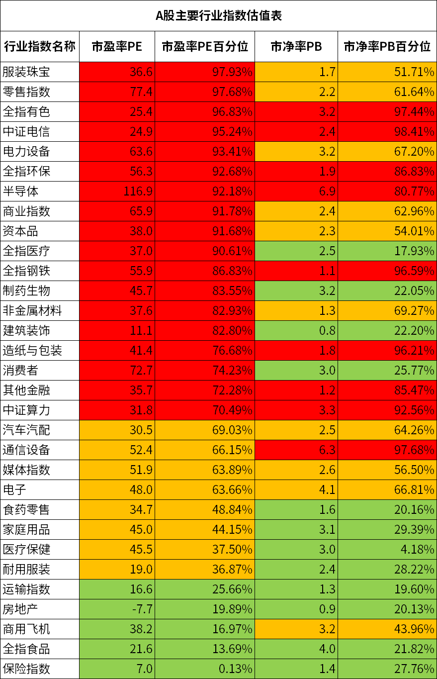 行业分化:零售、服装珠宝、电信、有色等PE/PB居历史高位;保险(PE 7.0/0.13% 分位)、全指食品、地产、运输等估值偏低。