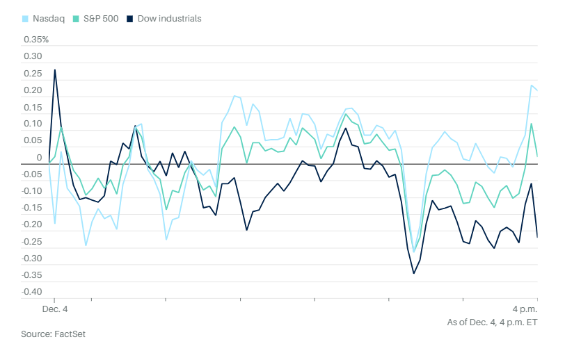 当天三大主要股指在平盘附近波动,最终道琼斯工业平均指数下跌32点,跌幅为0.1%。标准普尔500指数上涨0.1%,纳斯达克综合指数上涨0.2%。