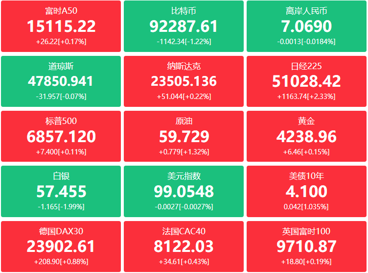 期货:现货黄金涨0.16%报4209.74美元,黄金期货涨0.15%报4238.40美元;现货白银跌2.33%报57.1375美元,白银期货跌1.93%报57.495美元,铜期货跌0.55%报5.3595美元;现货铂金跌1.45%。原油期货涨0.72美元,涨幅1.22%报59.67美元,布伦特原油涨0.59美元,涨幅0.94%报63.26美元;天然气期货涨1.36%报5.0630美元,汽油期货报1.8271美元;取暖油期货报2.3037美元。
