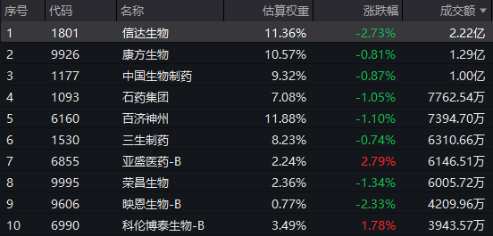 港股通创新药ETF(159570)标的指数权重股多数飘绿:信达生物跌超2%,石药集团、百济神州跌超1%,康方生物、中国生物制药、三生制药微跌。