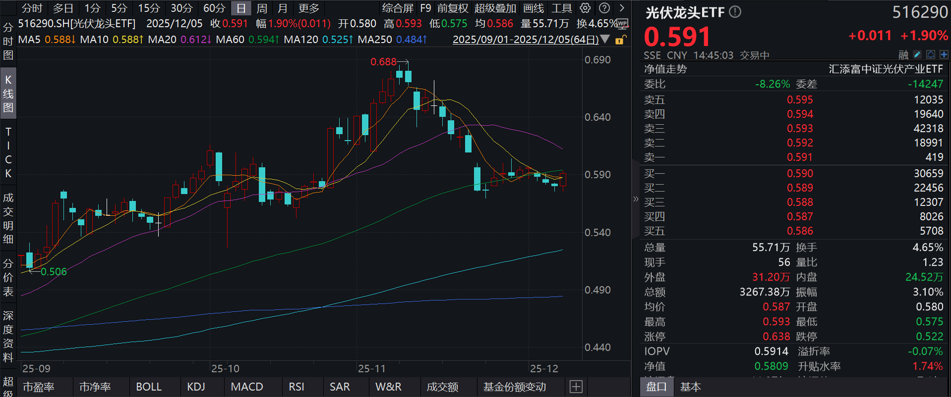 截至2025年12月5日 14:32,中证光伏产业指数(931151)强势上涨1.85%,成分股罗博特科(300757)上涨9.17%,科士达(002518)上涨6.57%,TCL科技(000100)上涨4.36%,博威合金(601137),阿特斯(688472)等个股跟涨。同类费率最低档的光伏龙头ETF(516290)盘中涨超2%,现涨1.90%,最新价报0.59元。拉长时间看,截至2025年12月4日,光伏龙头ETF近3月累计上涨10.06%。(以上所列股票仅为指数成份股,无特定推荐之意)