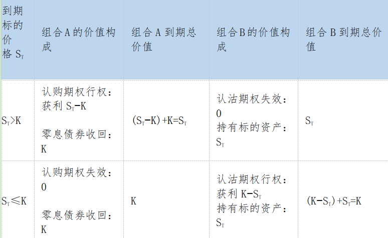 认购期权、认沽期权的执行价格为K,期限为T。组合A当前的价值是欧式认购期权的价值c和零息债券的价值Ke-rT;组合B当前的价值是欧式认沽期权在当前的价值p和标的资产S。