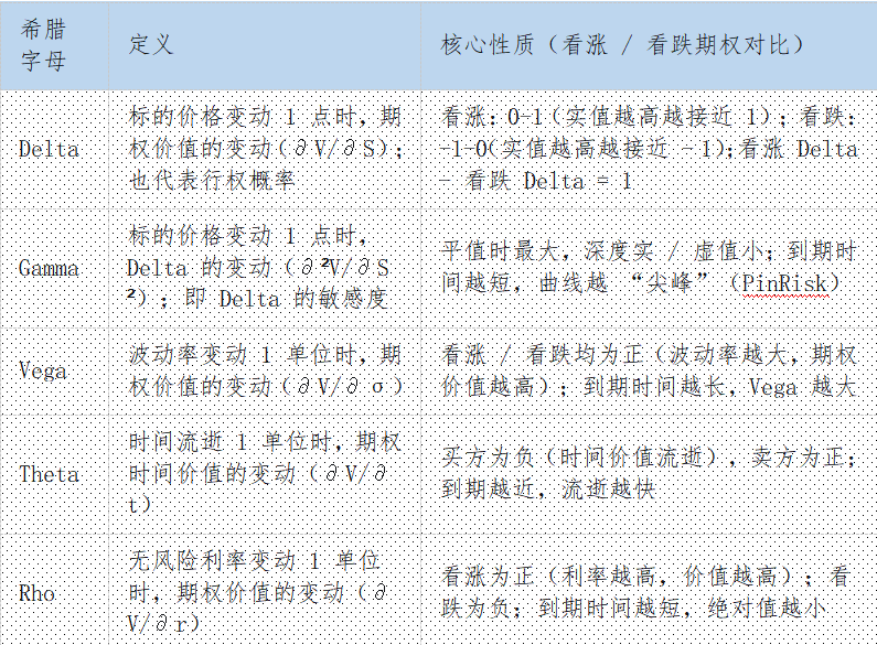 希腊字母用于衡量 “标的价格、波动率、时间、利率” 等因素变动对期权价值的影响,核心指标如下表: